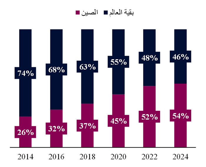 وقد حدثت قفزة مماثلة في قطاعات استراتيجية أخرى. أنتجت الصين حوالي 12.4 مليون سيارة كهربائية في عام 2024، أي ما يزيد عن 70% من الإنتاج العالمي، وبلغت حصة مُصنعي البطاريات الصينيين مجتمعة 56% من الطاقة الإنتاجية العالمية. وفي مجال الطاقة الشمسية، تهيمن الصين على أكثر من 80% من قدرات التصنيع العالمية عبر سلسلة القيمة بأكملها، من البولي سيليكون إلى الوحدات الجاهزة.