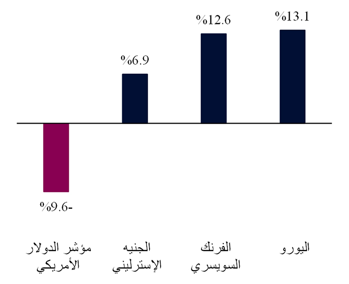 تعكس أسواق صرف العملات الأجنبية الصورة الأكثر وضوحاً لاتجاهات الاقتصاد الكلي العالمي، فهي ترتبط بشكل وثيق بتدفقات رؤوس الأموال وقرارات تخصيصها. وقد شهدت أسواق الصرف الأجنبي الرئيسية تقلبات كبيرة العام الماضي. فقد انخفض مؤشر الدولار الأمريكي (DXY)، وهو مؤشر تقليدي يقيس قيمة الدولار الأمريكي مقابل سلة مرجحة من ست عملات رئيسية، بنسبة 9.6% في عام 2025، مسجلاً بذلك إحدى أسوأ حالات الأداء للدولار الأمريكي منذ ما يقرب من عقد. في المقابل، ارتفعت قيمة اليورو والفرنك السويسري والجنيه الإسترليني بشكل ملحوظ مقابل الدولار الأمريكي.